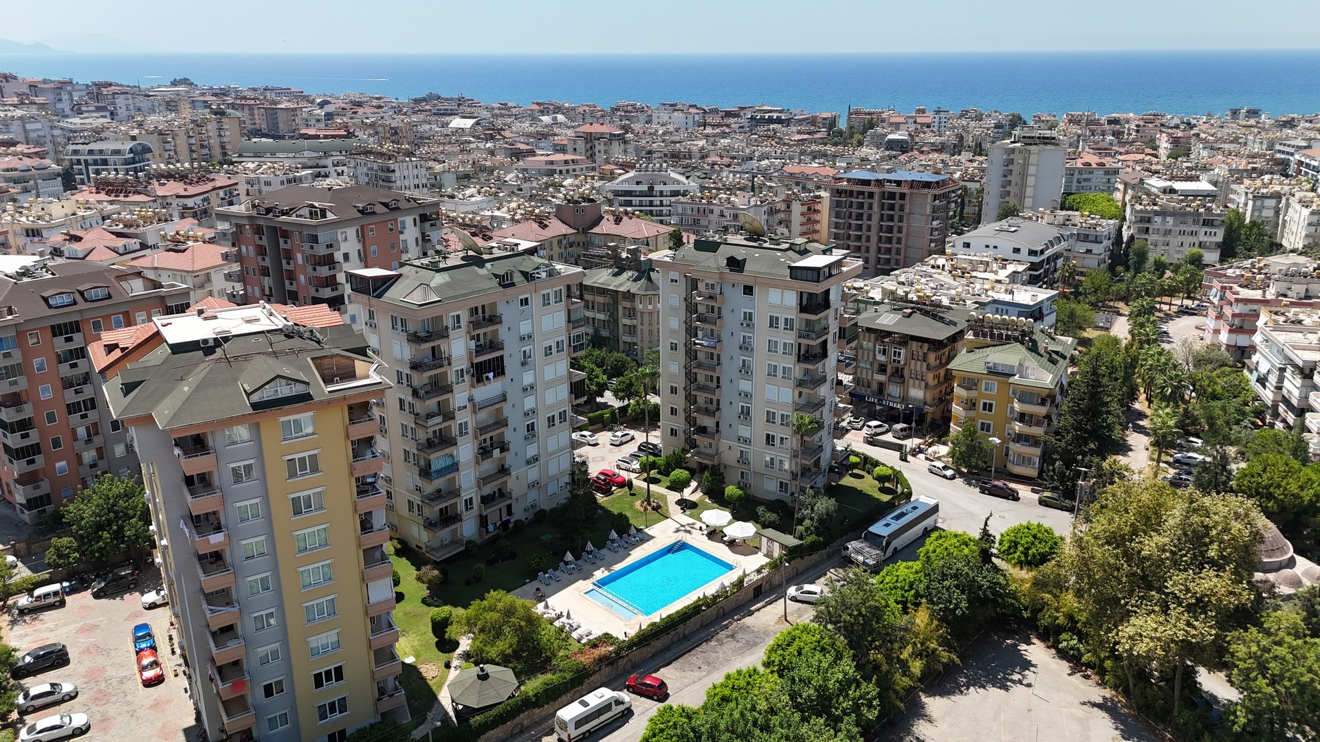 Die Anlage liegt nur etwa 700 Meter vom Mittelmeer entfernt. Der Stadtteil Güllerpinari ist besonders beliebt, weil er ruhiges Wohnen mit zentraler Anbindung verbindet. In direkter Umgebung finden Sie Supermärkte, Restaurants, Apotheken, Schulen und öffentliche Verkehrsmittel – alles fußläufig erreichbar.
