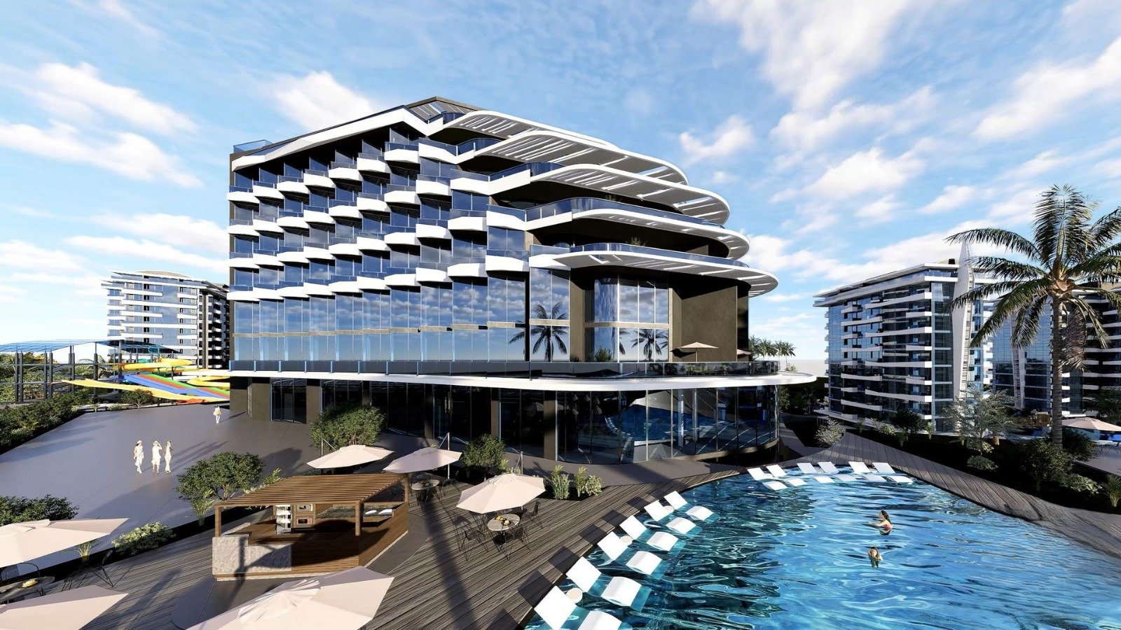 The complex offers hotel-style social amenities ideal for both living and vacationing. Each block includes a covered parking area and an outdoor swimming pool. Additional facilities include a Turkish bath, sauna, fitness center, football, basketball and volleyball courts, tennis court, mini golf, table tennis, and an aquapark.