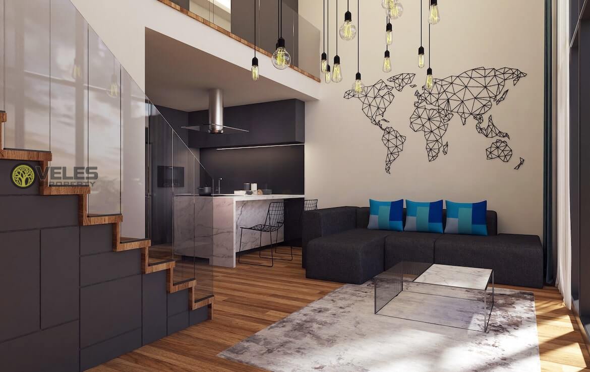 При входе в Лофт 1+1 вас будет встречать современная кухня и просторный зал. Ванная комната совмещена с санузлом. Большая спальня комната и терраса откуда открывается прекрасный вид.
