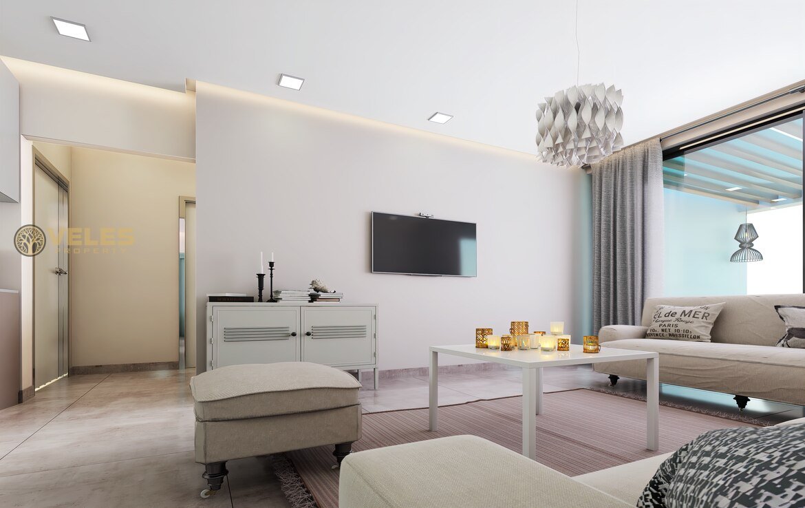Квартира включает 2 спальни с встроенными шкафами, главную спальню с собственной душевой комнатой и семейную ванную с современным дизайном. Встроенная кухня оснащена всей необходимой мебелью и техникой. Высококачественная керамическая плитка и современные окна с двойным остеклением обеспечивают комфорт и уют.