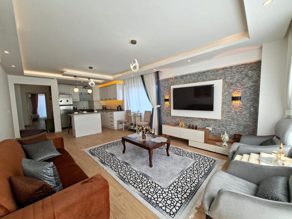 Квартира имеет планировку 4+1, 210 м² жилой площади и продаётся полностью меблированной. Также имеются 2 балкона, 1 терраса и 2 ванные комнаты, обеспечивающие простор и комфорт.