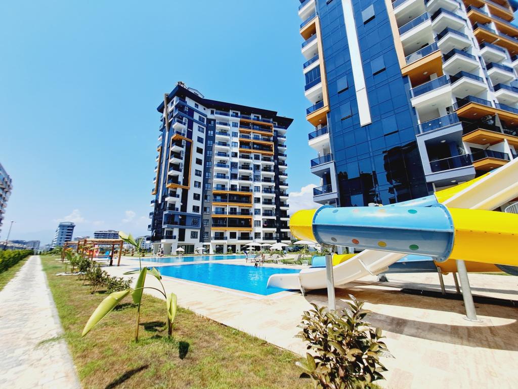 Alanya Mahmutlar’da yer alan bu 1+1 daire, 3. katta konumlanmış olup 50 m² kullanım alanına sahiptir. Daire eşyalı olarak sunulmakta ve modern, kullanışlı planıyla hem oturum hem de yatırım amaçlı değerlendirmeye uygundur. Toplamda 12 katlı binada yer alan daire, denize yaklaşık 600 metre mesafededir.Site, geniş sosyal olanaklara sahiptir. Açık ve kapalı yüzme havuzu, su kaydırağı, fitness salonu, sauna ve hamam gibi imkanlar yıl boyunca aktif bir yaşam sunar. Çocuk oyun alanı ve basketbol kortu, aileler için ekstra sosyal aktivite imkânı sağlar. Peyzajlı bahçe, açık otopark ve güvenlik hizmeti sayesinde hem konfor hem de güvenlik sağlanmaktadır.